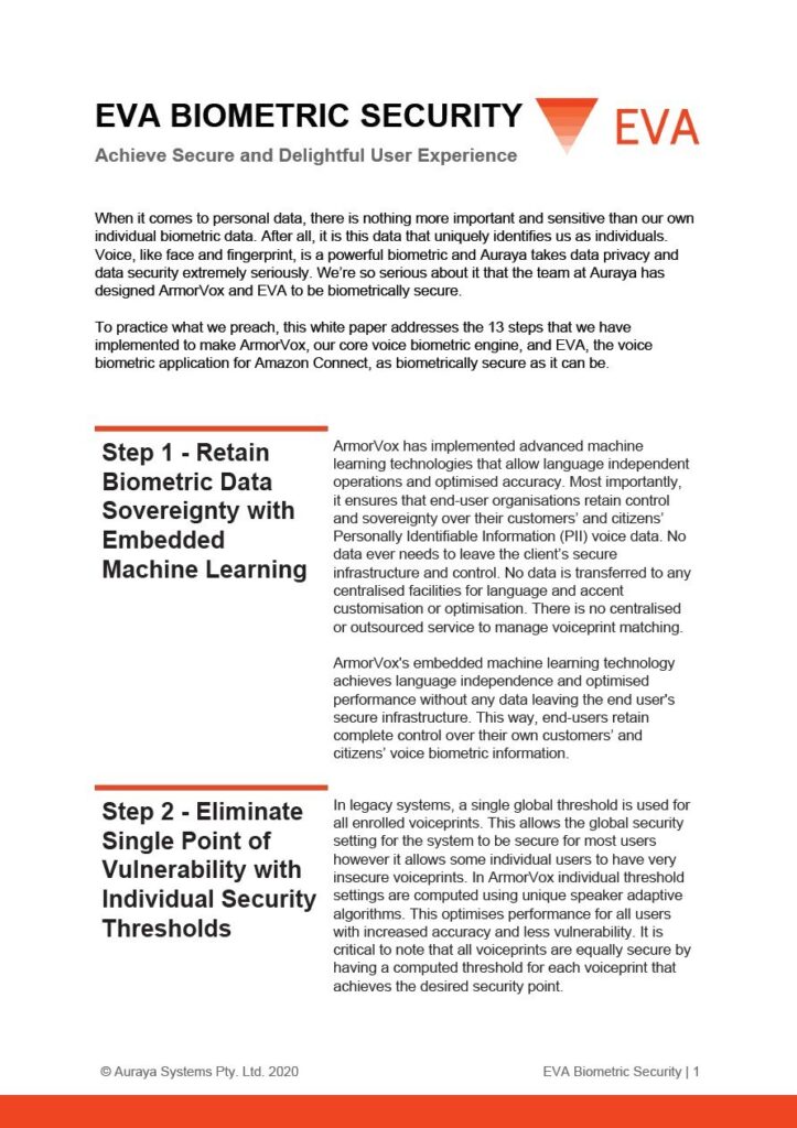 Powered by Auraya’s ArmorVox engine, EVA follows its secure design principles ensuring that it has been built to be biometrically secure while complying with the various regulatory compliance globally. This updated white paper covers the features and measures EVA takes to guarantee that its voice biometric capabilities properly handles sensitive and personally identifiable information and data.